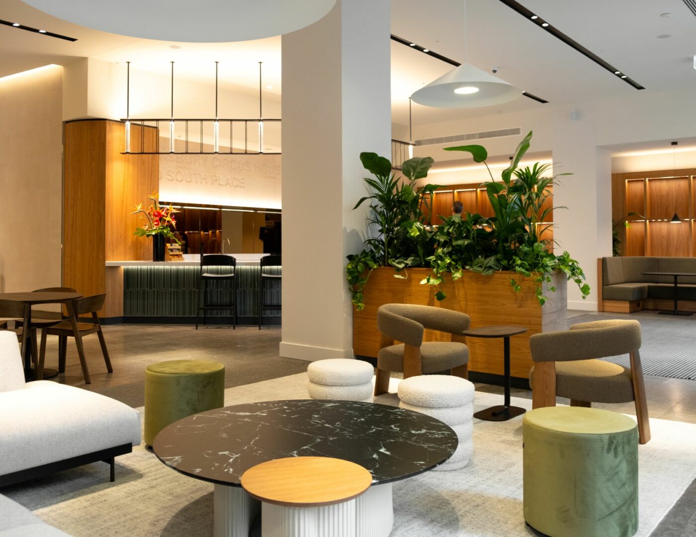 Description: Refurbishment of the reception at Finsbury Circus House, this included new general, feature and concealed lighting which combined gives a welcoming aura that creates a pleasant atmosphere for clients, suppliers, staff and visitors.